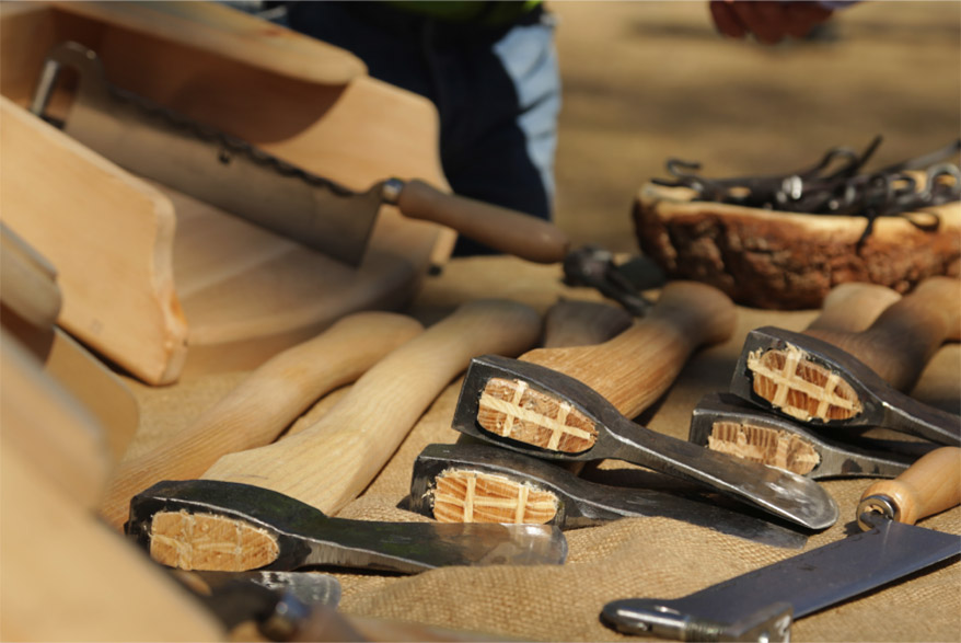 Waldbeile, Stockbeile und Hacken, Zimmermannsbeile, Troghacken, Zapine, Schindelmesser, Schäpser, Laubmesser, Runggln, Heutreten, Waalhauen, Schnitzelmesser, Schellenklachl (Klöppel), Nägel