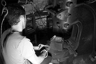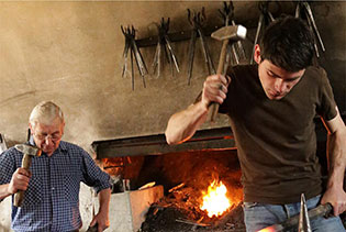 Neben der Herstellung von traditionellem Werkzeug fertigt er am Feuer in der Dorfschmiede in